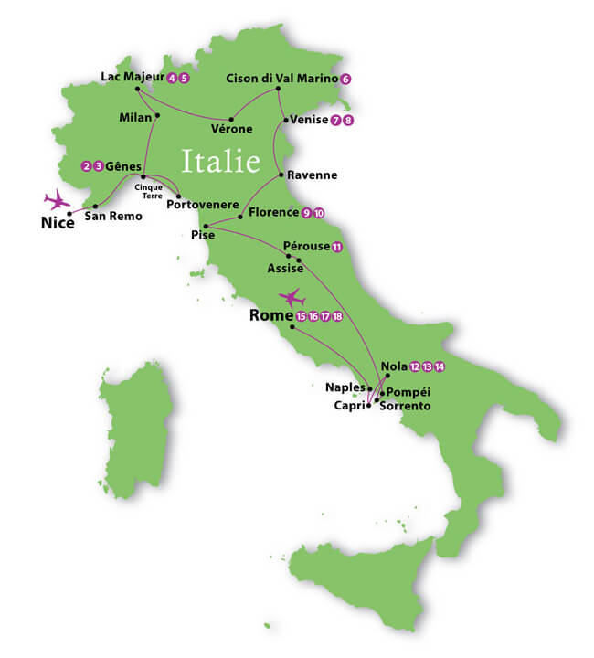 Un forfait enchanteur de 19 jours, en groupe, avec vols sans escale à l’aller, de Montréal vers Nice, et au retour, de Rome vers Montréal, et avec un guide national italien francophone. Le circuit comprend: 35 repas (en plus du petit-déjeuner de la journée supplémentaire à Rome et des repas dans l’avion), plus deux goûters, l’hébergement en hôtels 4* ainsi qu’une nuitée dans un fabuleux château au nord de la Vénétie, des repas typiques, une dégustation de vins, un autocar de luxe climatisé, les transports et les transferts, la manutention d’une valise par personne, ainsi que toutes les taxes et frais d’entrée. Vous aurez la chance de visiter Venise, Florence et Rome le soir et de souper au centre-ville. Un circuit recherché: Nice, San Remo, Gênes, les Cinque Terre, Milan, le lac Majeur, le lac d’Orta, Vérone, la route du Prosecco, Roncade, Venise, Ravenne, Florence, Pise, la route du Chianti, Corciano, Assise, Pompei, Sorrento, la Côte Amalfitaine, Capri, Anagni, Rome, le Vatican et plus encore… Un rêve se réalise! Accompagnés dès votre départ du Québec (pour les groupes de 25 personnes et plus).