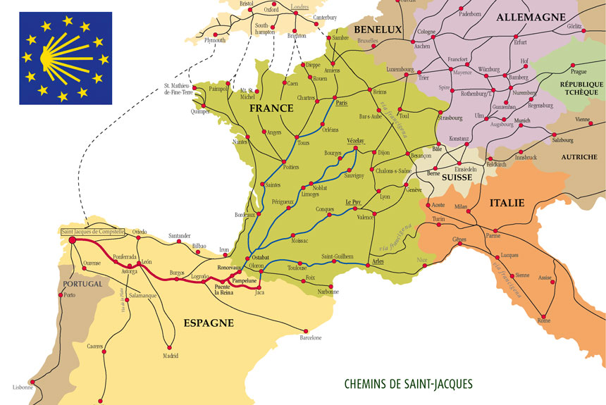 Les cheminsRoute du Puy en Velay, Camino Francès, Via Averna, Chemin d'Arles, Camino del Norte, Chemin de Cluny, Chemin de Genève, Via de la Plata et Via Lusitana.
