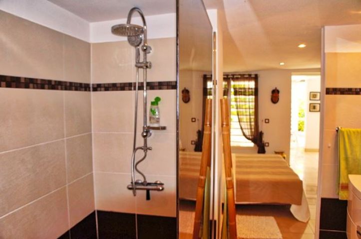 - Cuisine américaine ouverte sur le séjour via un bar avec 2 tabourets, 1 séjour avec table & 6 chaises de séjour, 1 salon avec canapé, fauteuils et TV écran plat, 2 chambres climatisées, 2 salle d’eau avec WC.