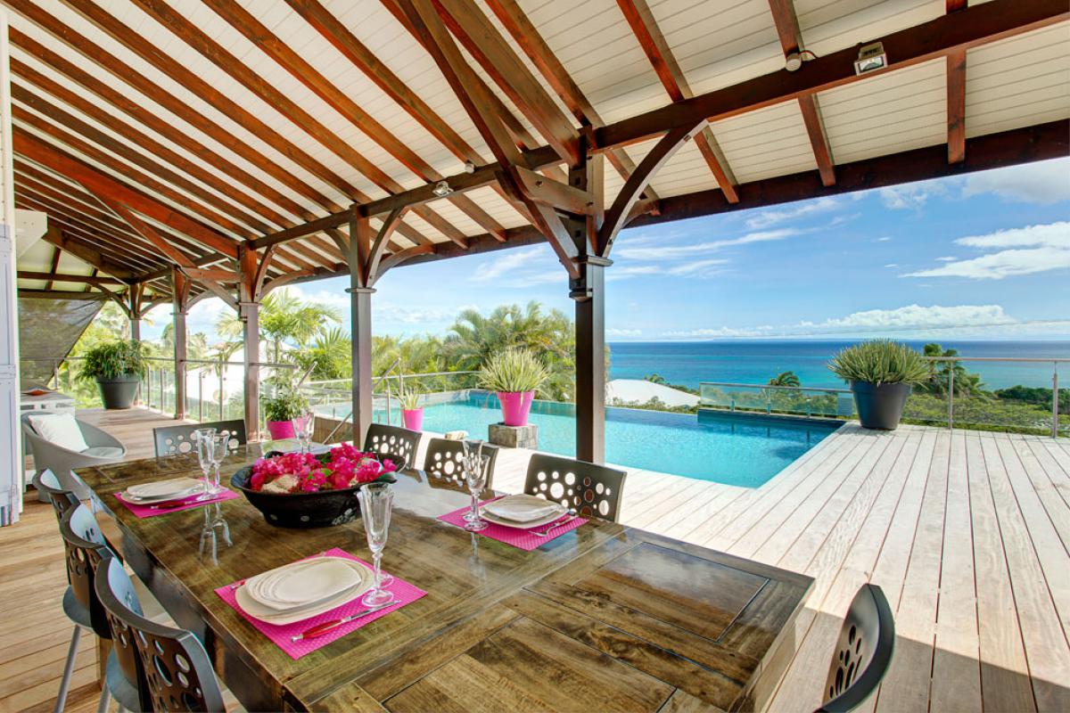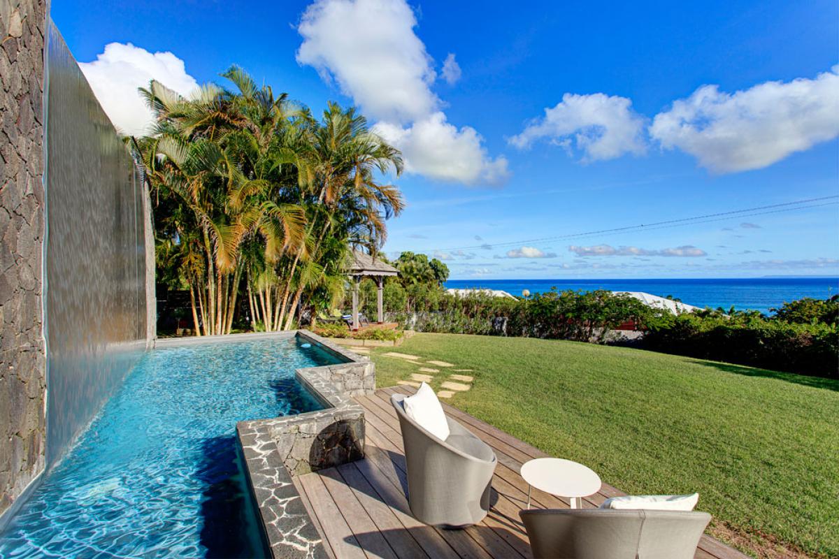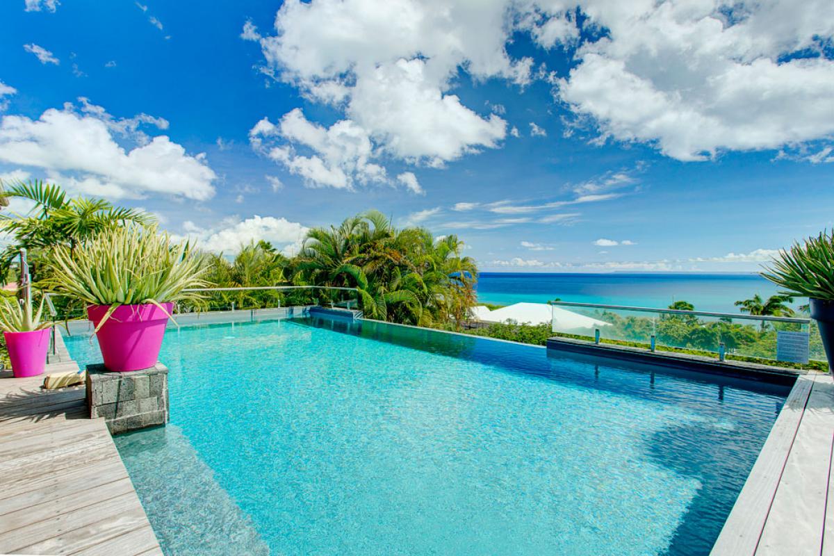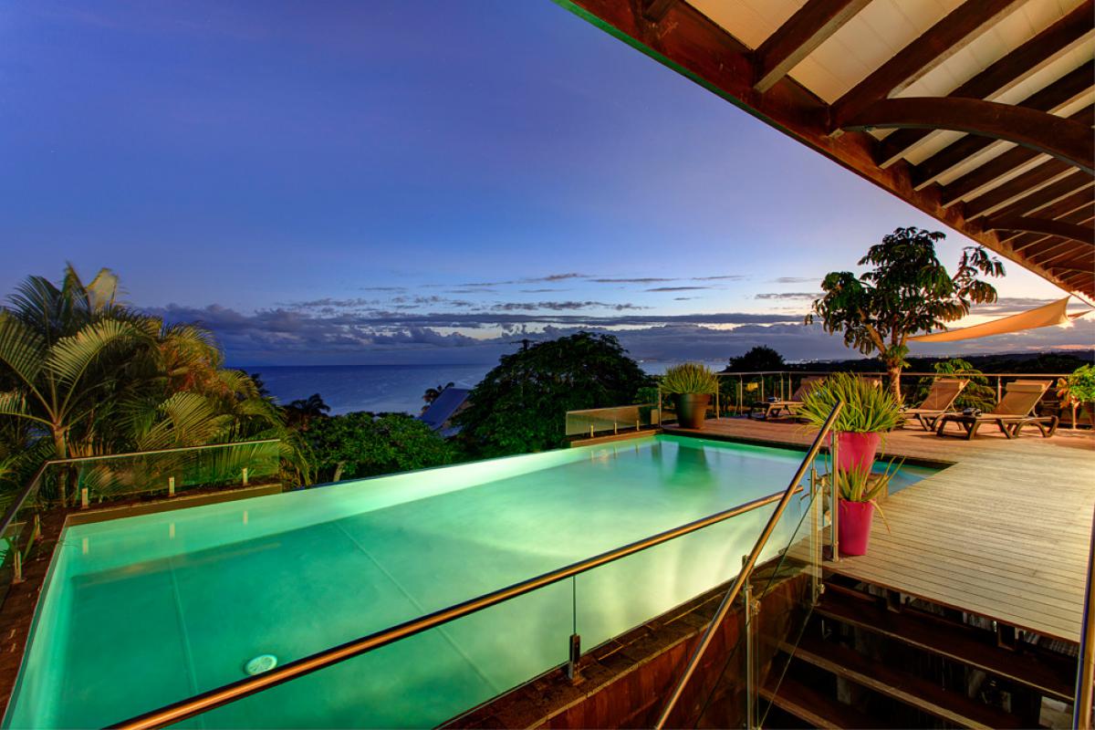 Que ce soit sur les terrasses près de la piscine à débordement se confondant aux couleurs de l’océan, dans les jardins, au abord du bassin inférieur ou sous les carbets balayés par les Alizées, vous apprécierez le luxe et le calme de cette villa de prestige où tout est réfléchit pour que vous profitiez au maximum de cette vue à 180° !!!