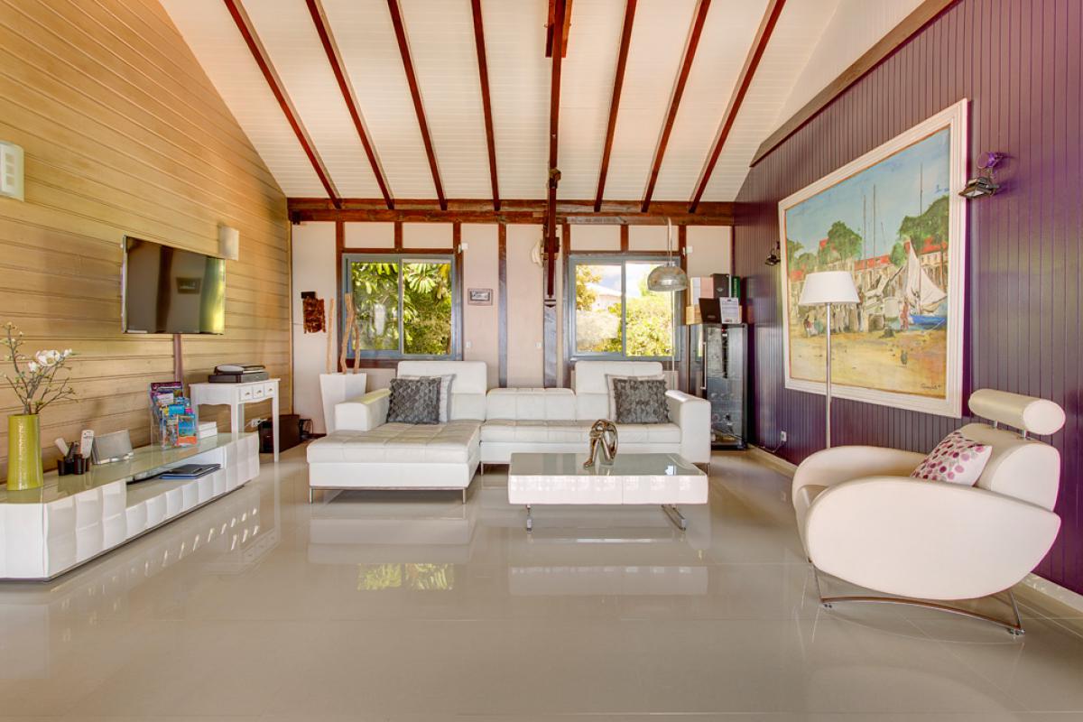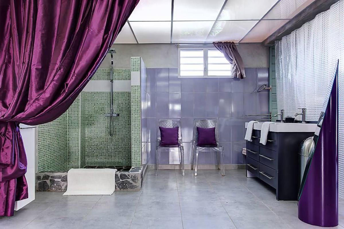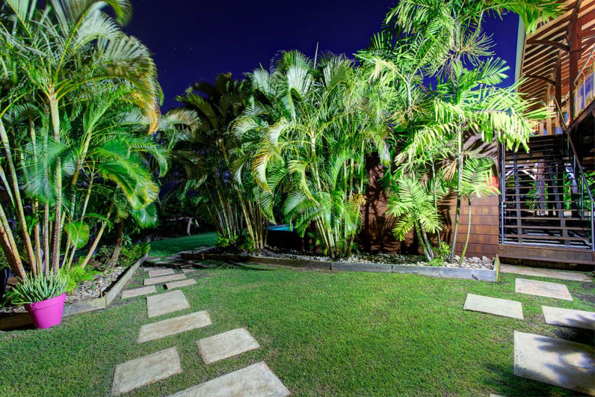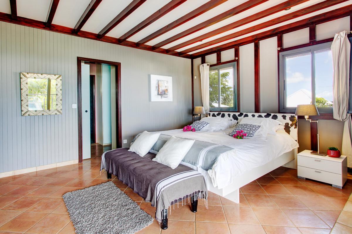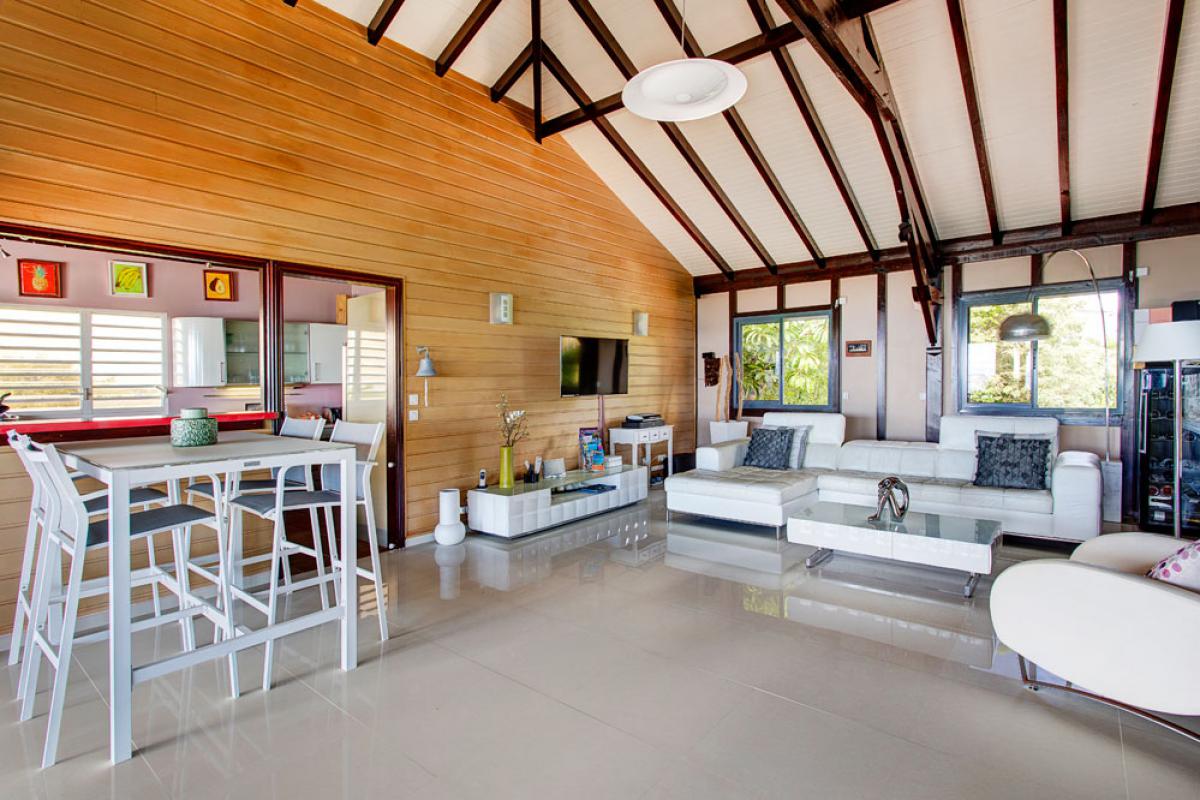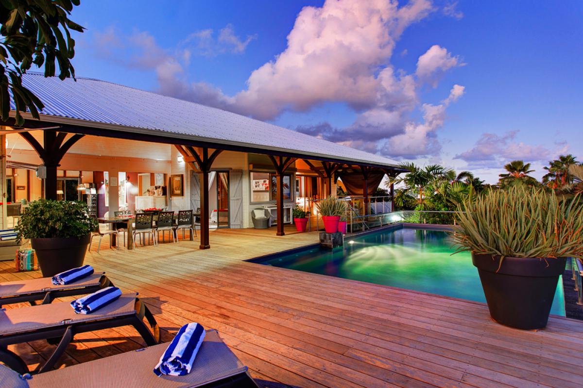 Construite sur un morne en bord de mer, au milieu d’un jardin tropical de 2000m2, la villa est située dans le quartier résidentiel du Helleux, sur la commune de Sainte Anne.