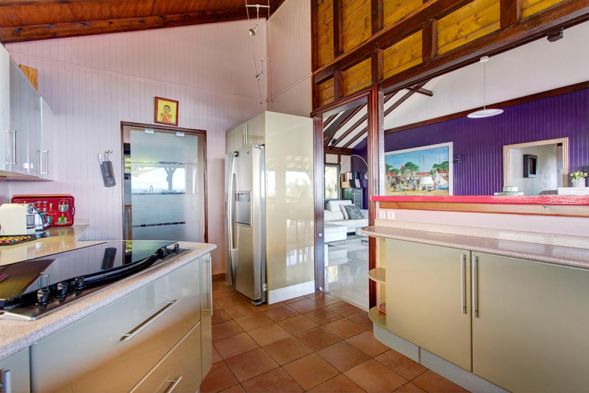 Une cuisine américaine très bien équipée et ouverte sur la terrasse, avec vue mer,