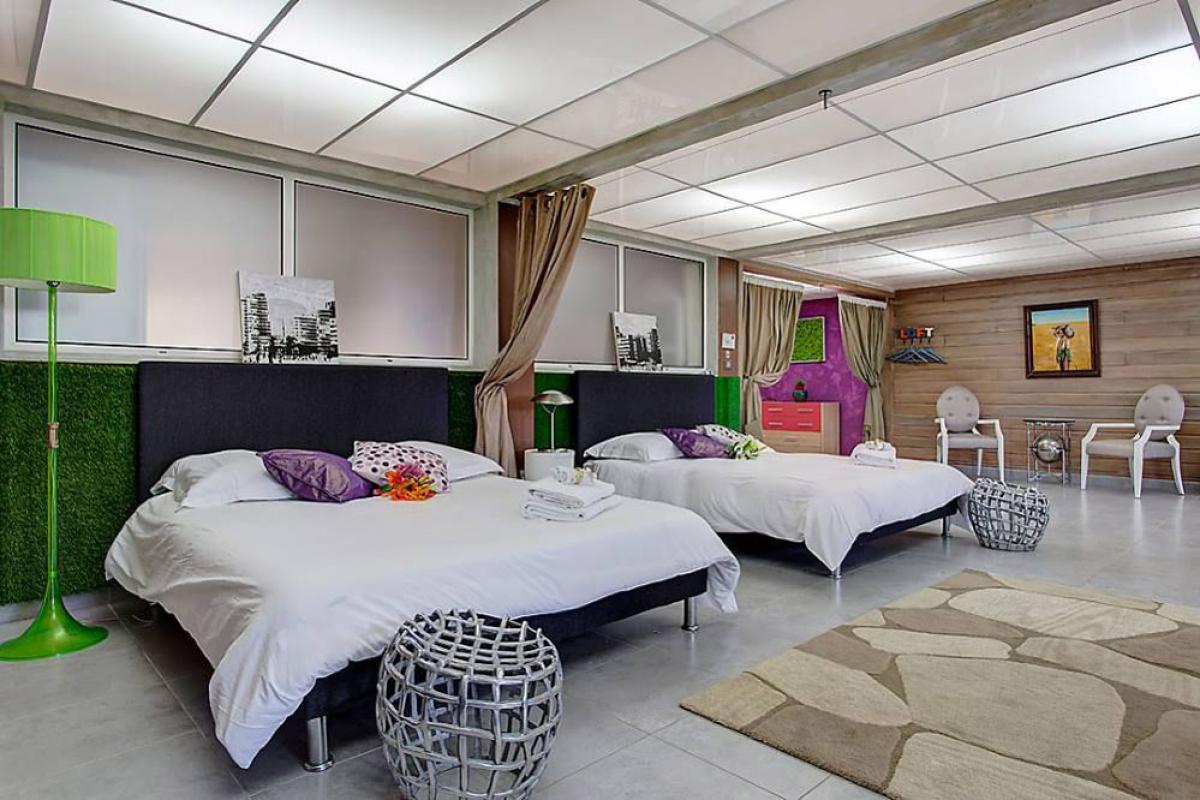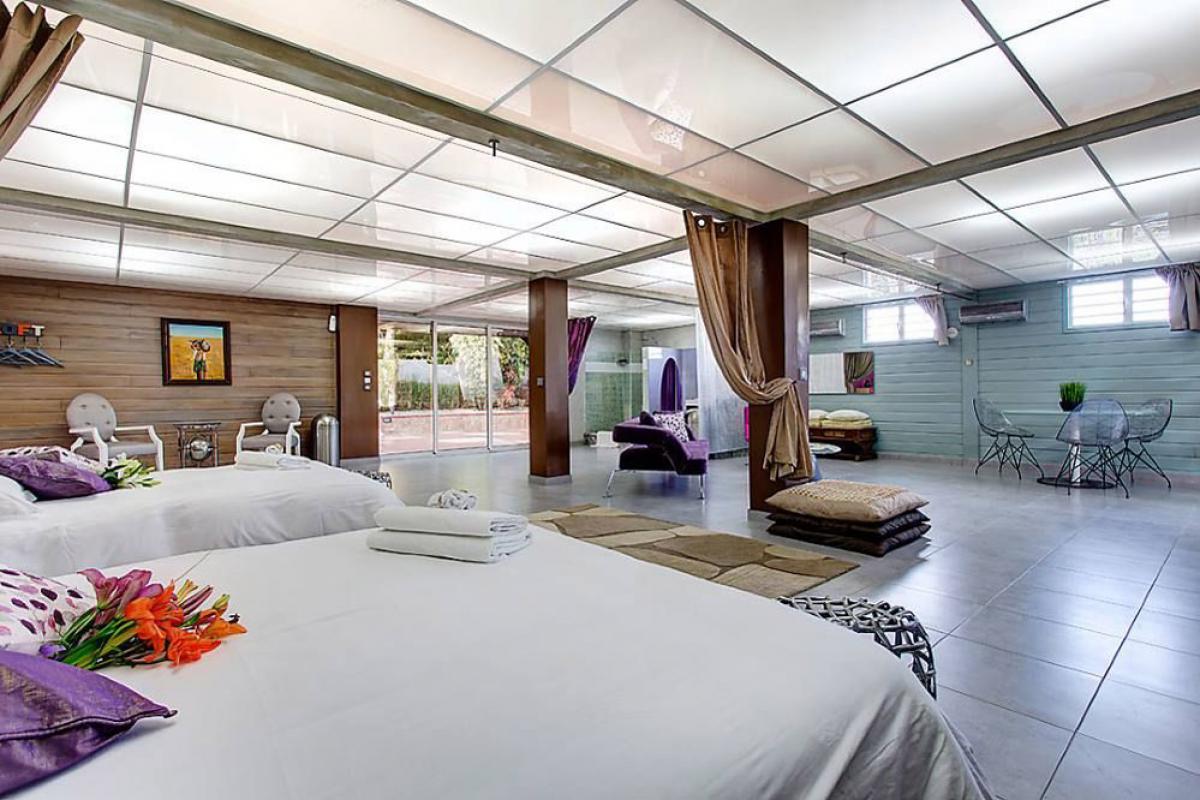 La Suite “Loft”, de 75m², climatisée et équipée de 2 lits doubles Queen Size (160cm) séparés par 1 rideau avec :