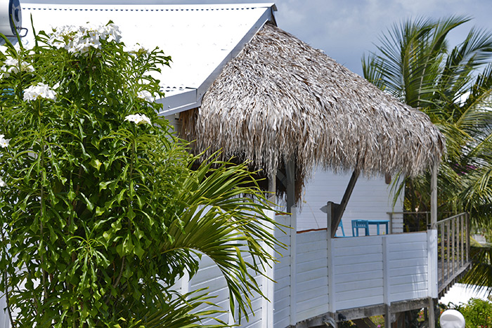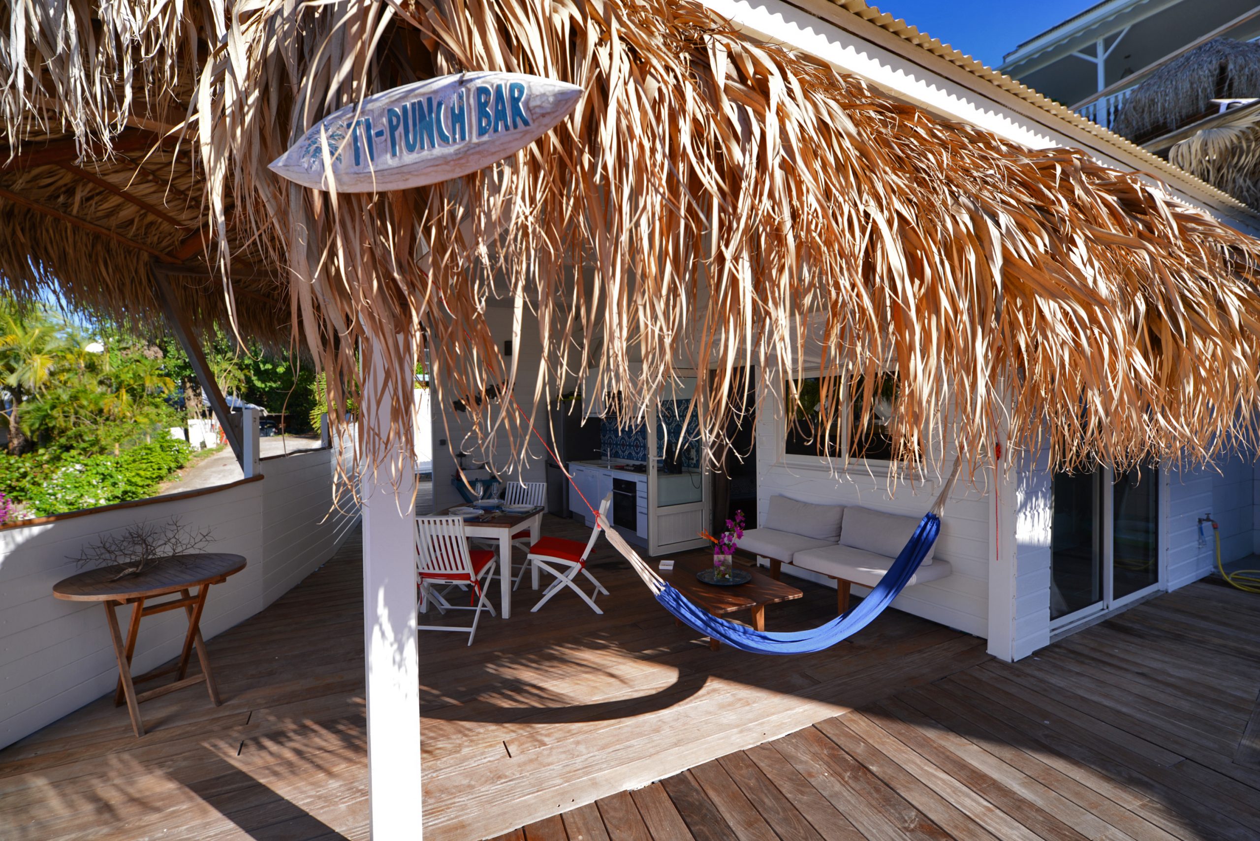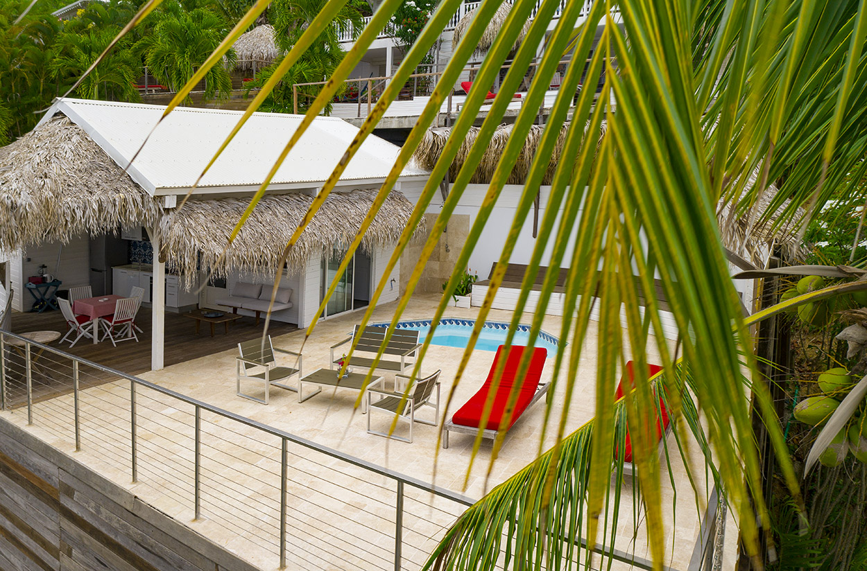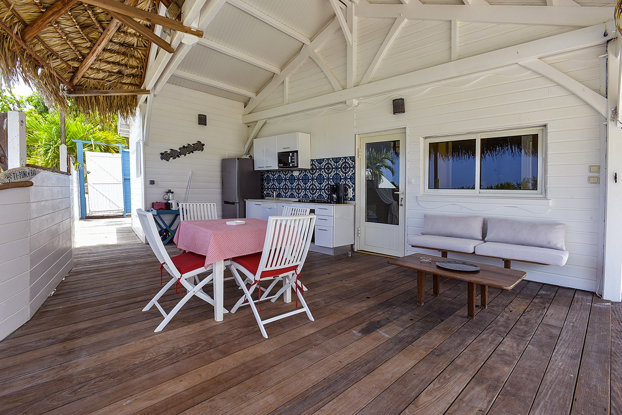 – Le Bac à punch privé sur une grande terrasse en bois exotique.