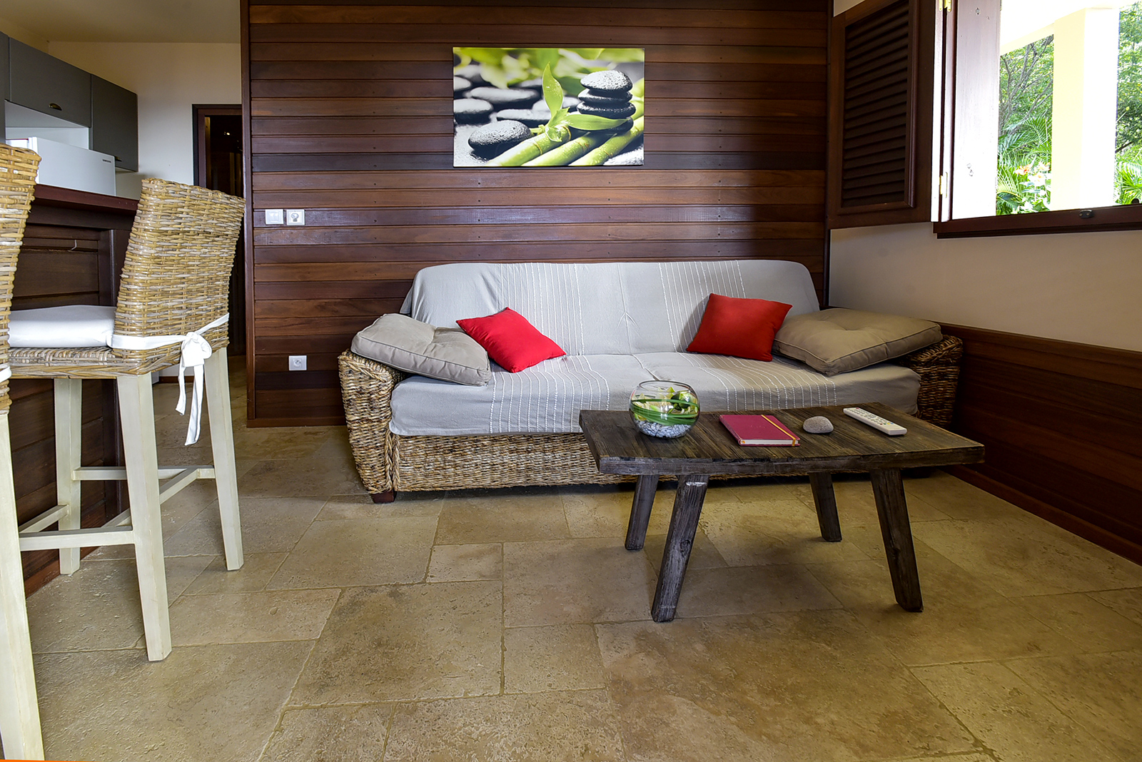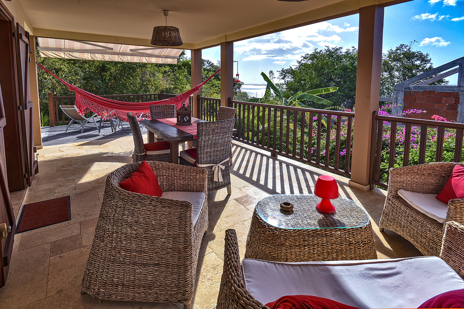 L’appartement vous accueille pour un séjour aux allures de croisière. Vous profiterez de la décoration soigneusement choisie par la propriétaire dans un cadre verdoyant avec une jolie vue sur la mer. Les propriétaires charmants, vous accueilleront dans cette location en rez de jardin de leur maison créole.