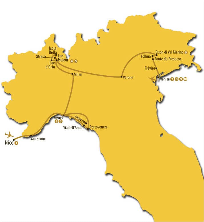 La beauté de l’Italie du Nord de Nice à Venise, un forfait prestigieux de 10 jours en groupe, guidé et accompagné, incluant une journée en totale liberté à vivre à votre rythme afin de découvrir Venise (repas non inclus). Offert avec vols sans escale, à l’aller Montréal/Nice et au retour Venise/Montréal. Le circuit comprend: 15 repas plus un goûter, en Italie, du Jour 2 au Jour 8, et l’hébergement en hôtels 4*, plus une nuitée dans un fabuleux château au nord de la Vénétie. Profitez de ce magnifique circuit de haut de gamme pour visiter Nice, San Remo, Gênes, les Cinque Terre, Milan, le lac Majeur, le lac d’Orta, Vérone, la route du Prosecco, Roncade et Venise. Et pourquoi ne pas saisir l’occasion unique de jumeler ce circuit avec une croisière de 8 jours, au départ du port de Venise? Faites-vous plaisir et voguez à la découverte de la Grèce et de la Turquie pour couronner ce merveilleux périple en Italie!