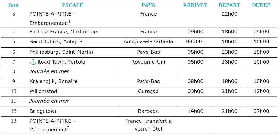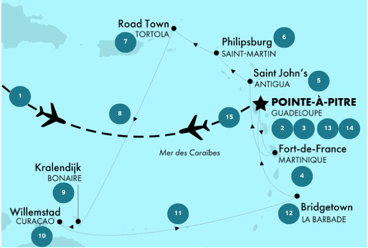 Au départ de Pointe-à-Pitre, en Guadeloupe, vous découvrirez les trésors cachés des Caraïbes à bord du Renaissance, un navire à dimensions humaines de 629 cabines et au service impeccable. Vous plongerez dans l’ambiance chaleureuse de Fort-de-France en Martinique, avant de vous émerveiller devant les plages paradisiaques d’Antigua et le charme franco-néerlandais de Saint-Martin. Vous explorerez les paysages sauvages de Tortola dans les îles Vierges britanniques, les récifs coralliens préservés de Bonaire et la vibrante architecture colorée de Curaçao. Vous terminerez cette immersion tropicale en beauté sur les rivages dorés de La Barbade, avant de regagner la Guadeloupe.  En plus de cette fabuleuse croisière, expérimentez la vie caribéenne avec un court séjour sur place, soit deux journées avant la croisière et deux autres au retour. Le jour 2, votre accompagnatrice vous fera découvrir les merveilles de l’île et le jour 14, vous aurez tout le loisir de vous détendre et vous faire bronzer sur la plage, devant la mer turquoise des Caraïbes.  Des vacances de rêve vous attendent, alors faites vos valises et tous à bord !