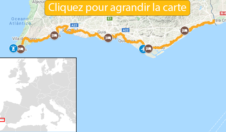Vous longerez ainsi la côte sud de l’Algarve, entre plages de sable fin paradisiaques, immenses falaises de calcaire et collines verdoyantes. Partez à la découverte de cette région exceptionnelle au fil de vos balades à vélo, à travers ses villages de pêcheurs, ses villes historiques au patrimoine bien conservé, comme Tavira, Faro et Lagos, ses secrets et son histoire particulière.